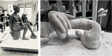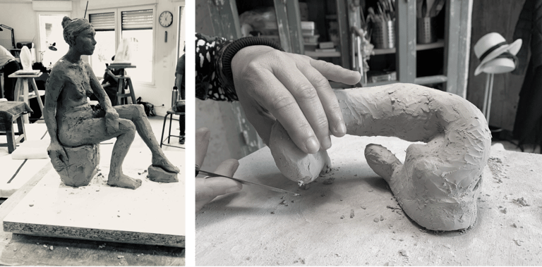 Dans les ateliers de terre et feu auprès de Patricia Maze et Pierre Mouchet pour le modèle vivant et modelage et lors de stage à l’atelier Jules Verne auprès de Florence Lemiegre.